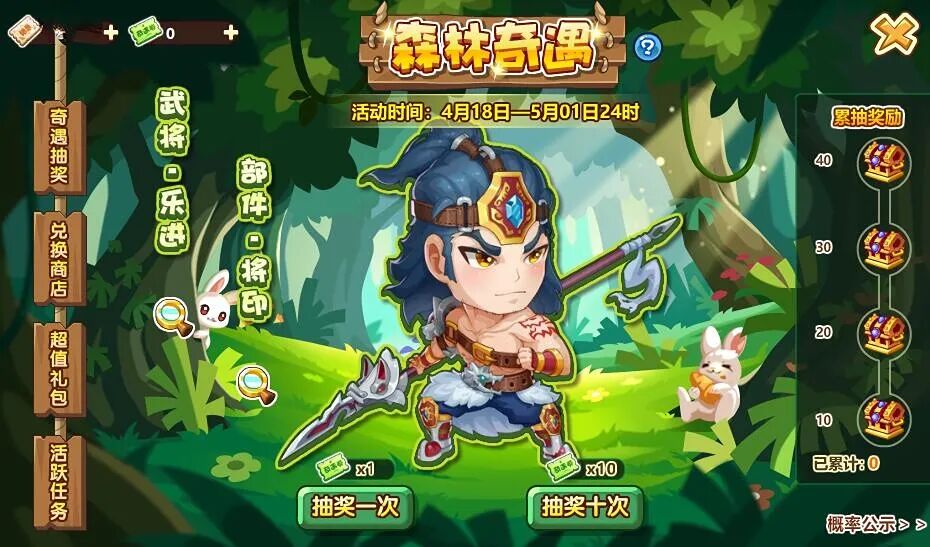 每一次抽奖需要消耗一个森林奇遇券;每抽奖一次,会获得60奇遇积分,同时会获得一件随机道具
