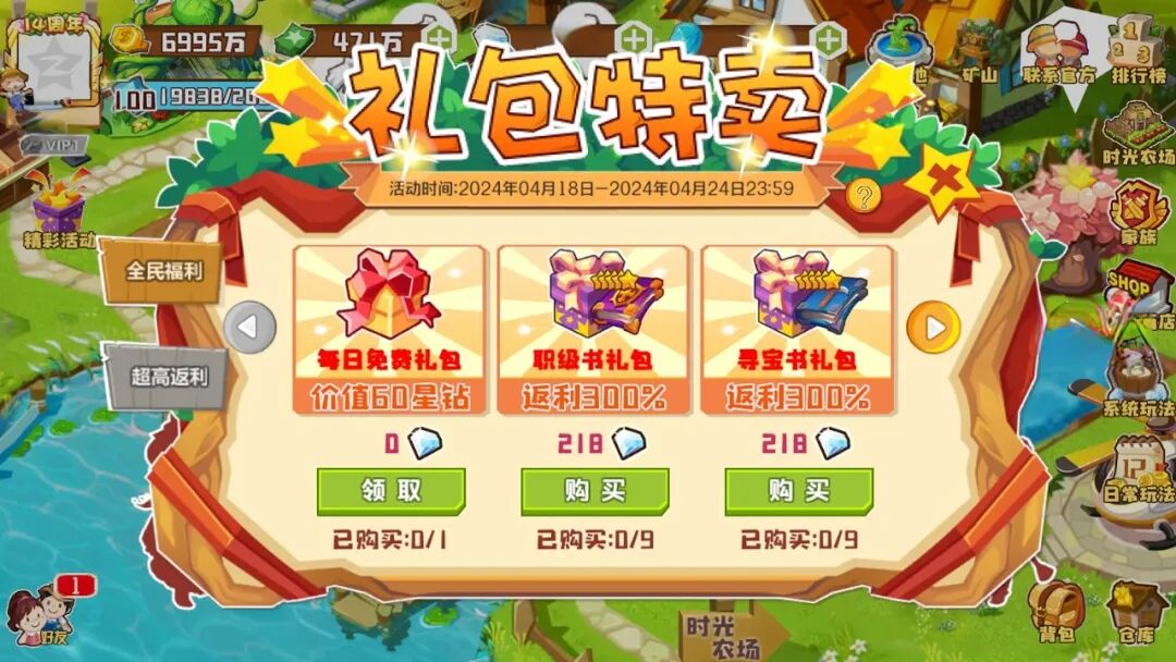 活动期间每日可领取价值60星钻的免费礼包1份。同时可使用星钻享受超低折扣购买指定礼包,每种礼包有限购次数。