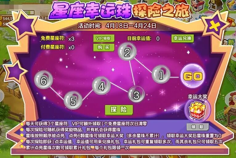 星珠按照顺序被点亮,点亮6颗星珠可领取幸运大奖(多余星珠不累计),领取幸运大奖后星珠重置为0;