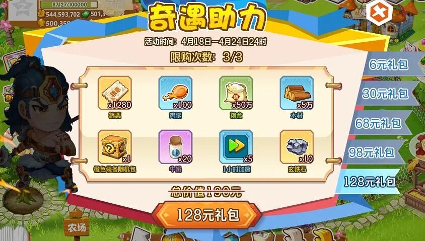 礼包5:征兵令x50、1小时加速x20、1小时建筑加速x20、1小时训练加速x20、1小时学府加速x20、粮食x6000000、木材x300000、奇遇币x3000