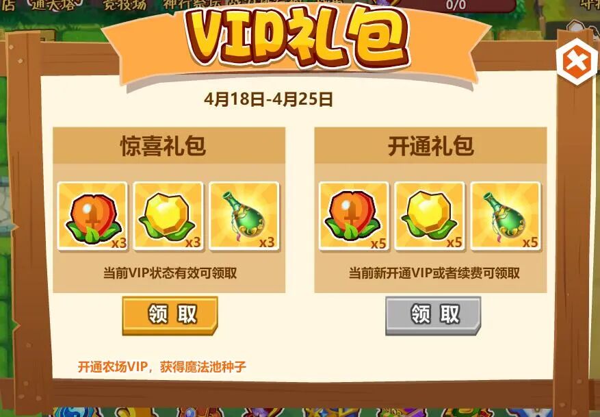 活动期间VIP生效的玩家可领取礼包一,新开通或续费的玩家可领取礼包一和二。
