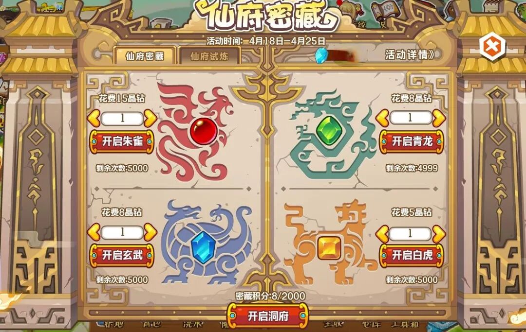 活动期间玩家可使用晶钻开启石门上的神兽,开启后可获得洞府积分以及对应宝石。宝石用于装备镶嵌系统。