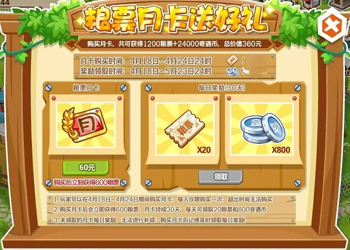 购买月卡后会立即获得600粮票,月卡时间持续30天,每天可领取一次月卡每日奖励:粮票x20、奇遇币x800(最多可领取30次)