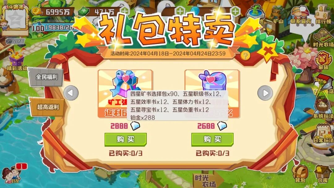 本期礼包分为【全民福利】碎片包以及【超高返利】矿山升级包,可点击左侧页签切换。