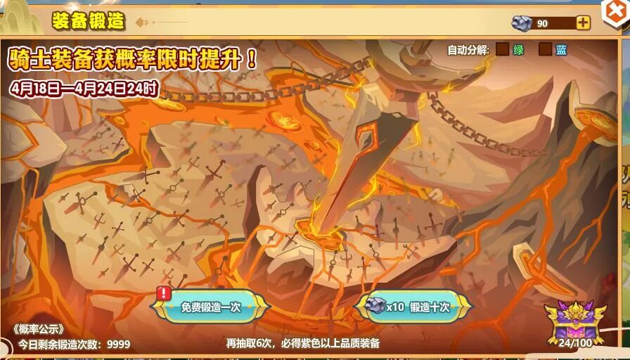 活动期间内,装备锻造和宝箱奖励中的骑士装备获得概率大幅度提升