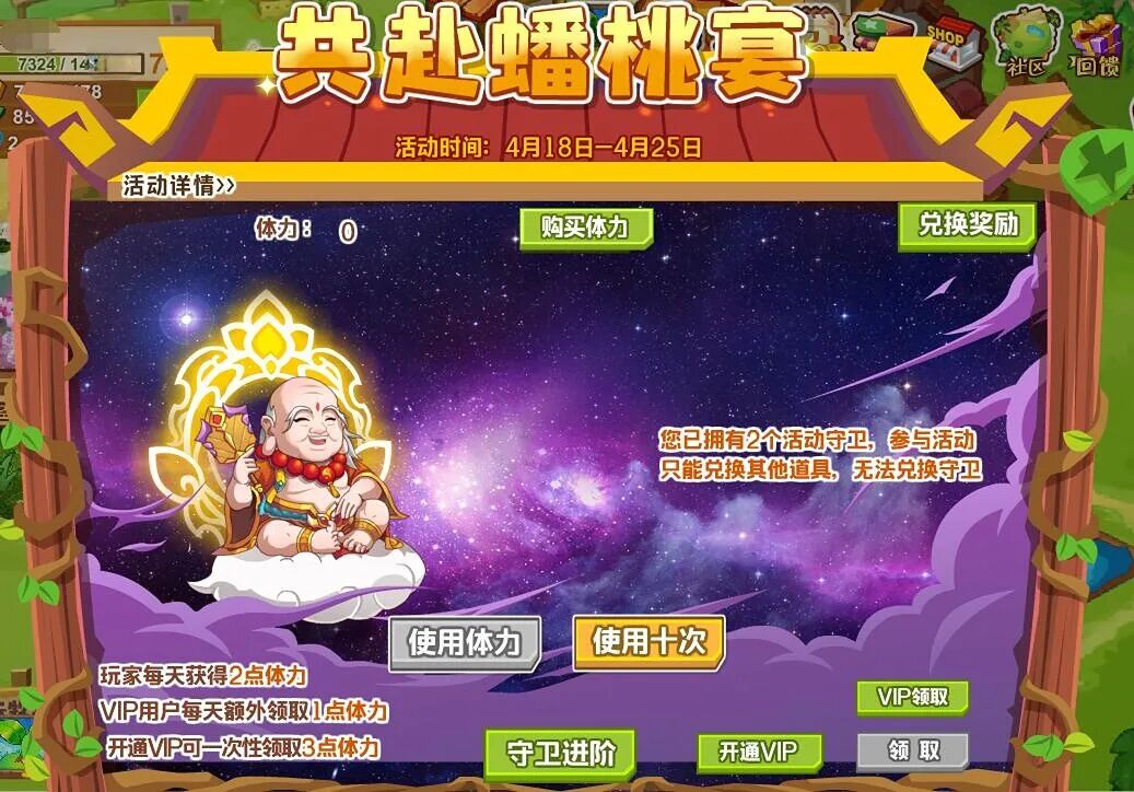 活动期间玩家每日登录游戏打开活动页面可以获得2点体力,VIP可额外领取1点体力。使用体力可获得进度和积分,积分可兑换赤脚大仙守卫和道具奖励。赤脚大仙需使用道具【混元金丹】进阶为混元赤脚大仙。
