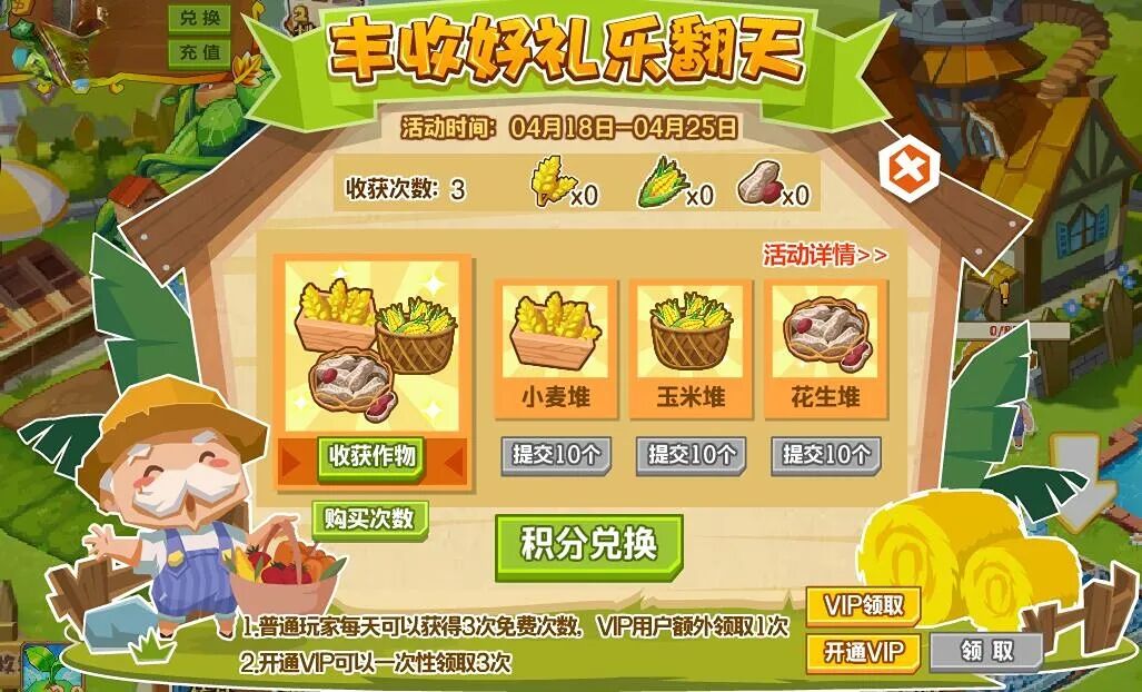 活动期间每天可以获得免费次数收获作物,每次收获可获得不同数量的作物,提交作物可获得积分。积分可兑换礼包奖励。