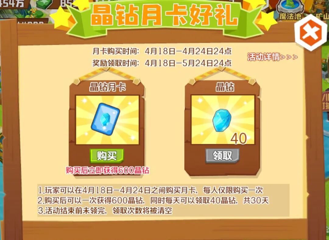 活动期间可购买晶钻月卡,一次性获得600晶钻,并可以在接下来30天,每天领取40晶钻。