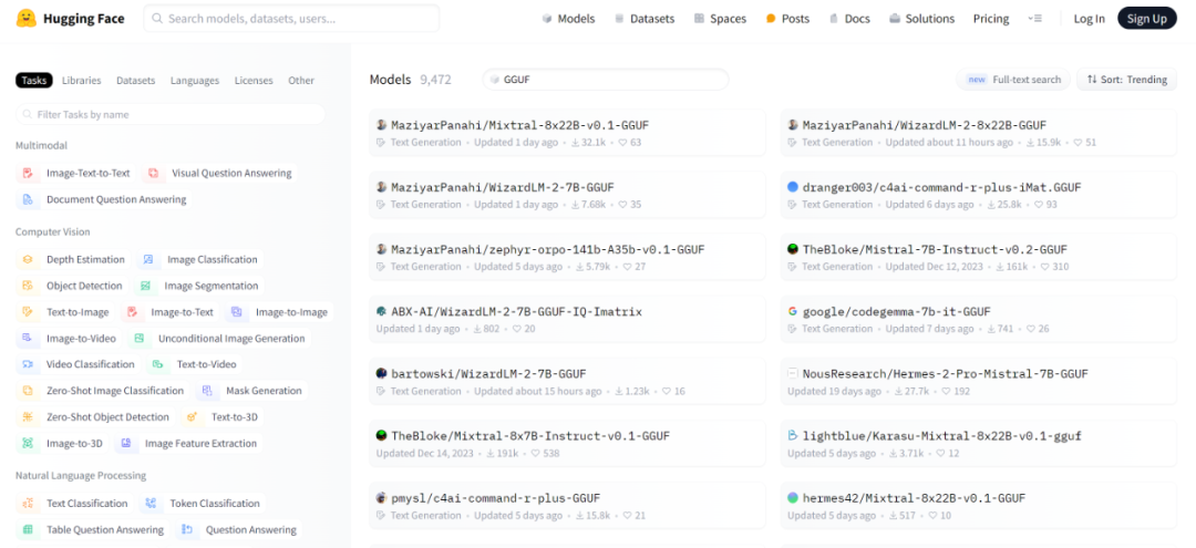 那么当然,你也可以选择查看HuggingFace的这个大模型榜单,同样找到模型后搜索GGUF格式即可。