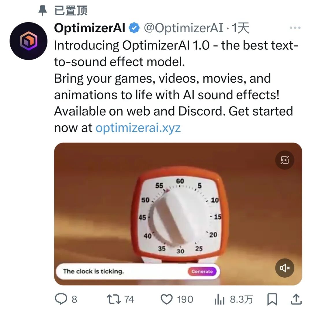 Optimizer AI是一款音效生成工具,早前“头号AI玩家”用它制作了一支AI科幻短片,负责视频中的音效部分。其中,Optimizer AI生成的环境音效果令人惊喜,如鸟鸣声、雨声等。但在人声方面,如孩童的笑声,还是存在较重的“AI味”,甚至让人有些“毛骨悚然”。4月15日,Optimizer AI在X上宣布升级到了1.0版本,称效果比之前有了较大幅度提升。感兴趣的玩家,可以前往Optimizer AI官网或Discord体验:https://discord.com/invite/bgfnVaaU2n