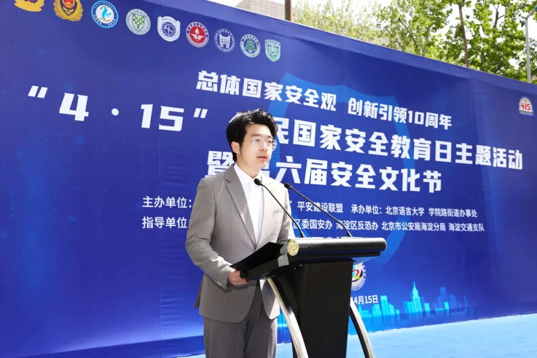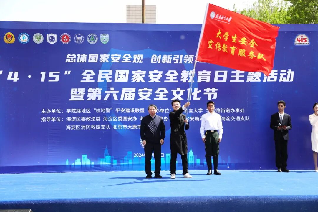 开幕式上,海淀区委常委、政法委书记程培衡为北京语言大学大学生安全宣传教育服务队授总旗,服务队下设反诈先锋队、消防先行队、交通护航队,未来将充分发挥青年学生在平安校园建设中的能动作用,让学生更好地承担起维护国家安全的责任和义务。