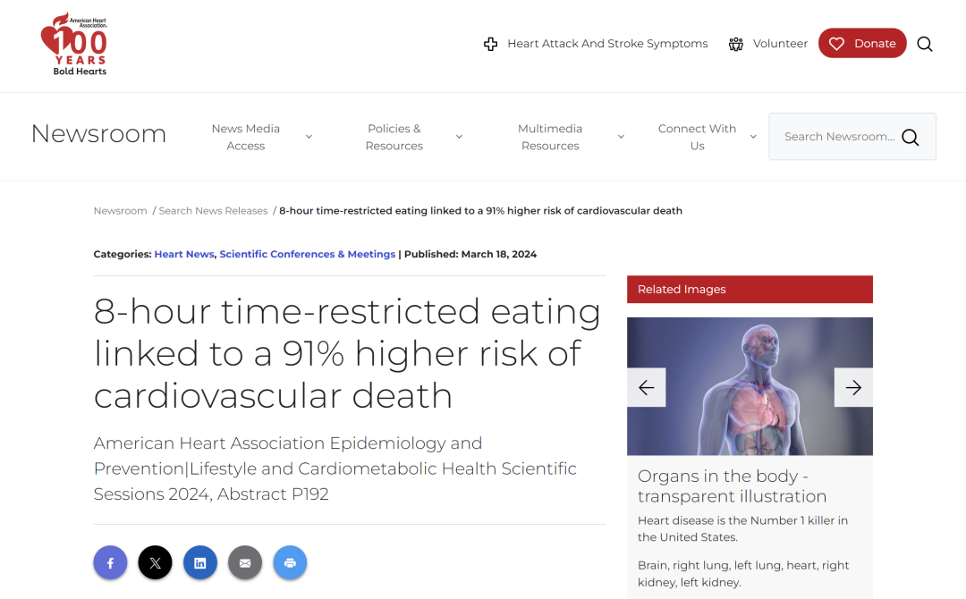 2024年3月18日至21日,美国心脏病协会在芝加哥举行了EPI|2024年生活方式科学会议。在会议上,上海交通大学医学院流行病学家钟文泽教授团队报告了一项初步研究。研究结果显示,16+8轻断食会增加心血管病死亡风险91%①。