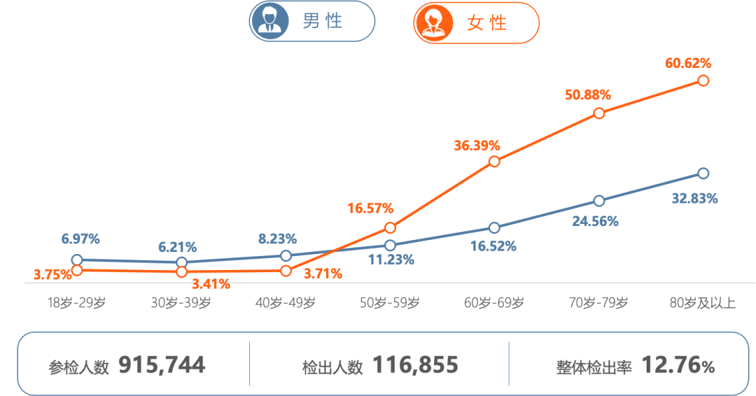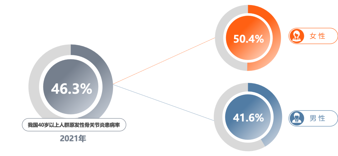 骨关节炎被称为“不死的癌症”,可导致关节疼痛、畸形与功能障碍,还可能显著升高心血管事件、下肢深静脉血栓栓塞、髋部骨折甚至是全因死亡率风险。据数据统计显示,我国骨关节炎患者已超1.4亿②,40岁以上人群原发性骨关节炎总体患病率已高达46.3%③。女性无论从患病率还是伤残损失生命年均比男性高,并随年龄增长而上升。