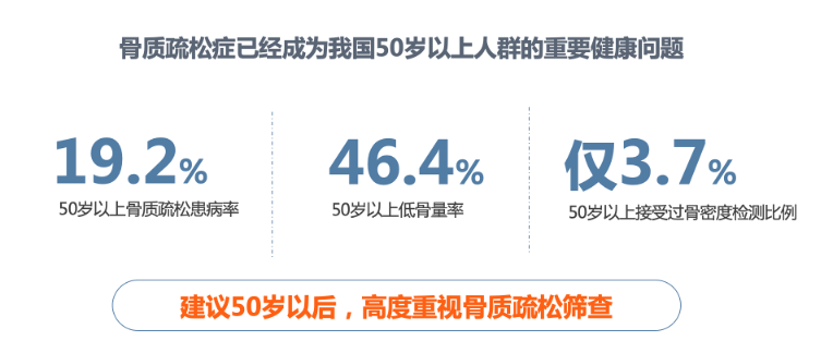骨质疏松症被认为是骨健康中最普遍和最具挑战的一种骨病,其严重后果即为骨质疏松性骨折,其中髋部骨折是老年人致残和致死的主要原因之一。数据显示,我国50岁以上人群的骨质疏松症患病率达19.2%,50岁以上低骨量率更高达46.4%。然而50岁以上人群中,接受过骨密度检测的比例仅为3.7%,患者的患病知晓率也只有7.0%①。与高患病率相对的,是低知晓率和低检测率。