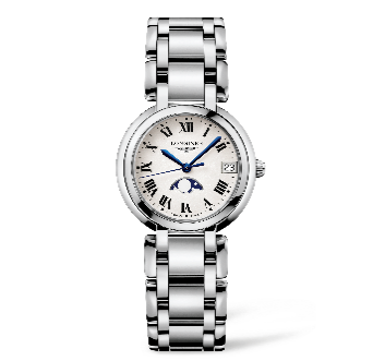 浪琴表心月系列腕表,搭载L296 石英机芯,表款直径30.5毫米。银色表盘上饰罗马数字时标,与蓝钢指针相得益彰。表盘显示时、分、秒, 3时位置设日期显示窗,6时位置设月相显示。配备精钢表链。