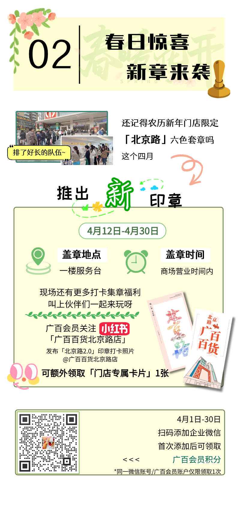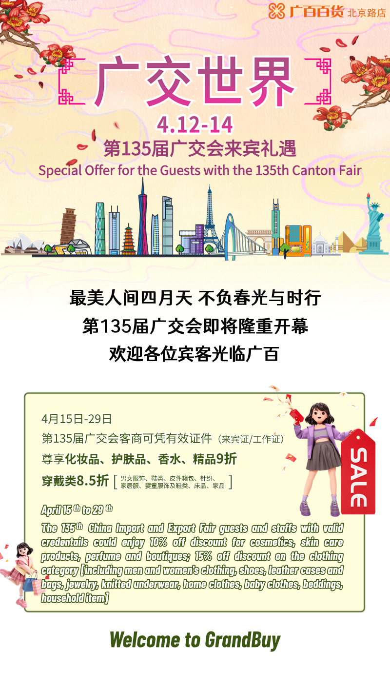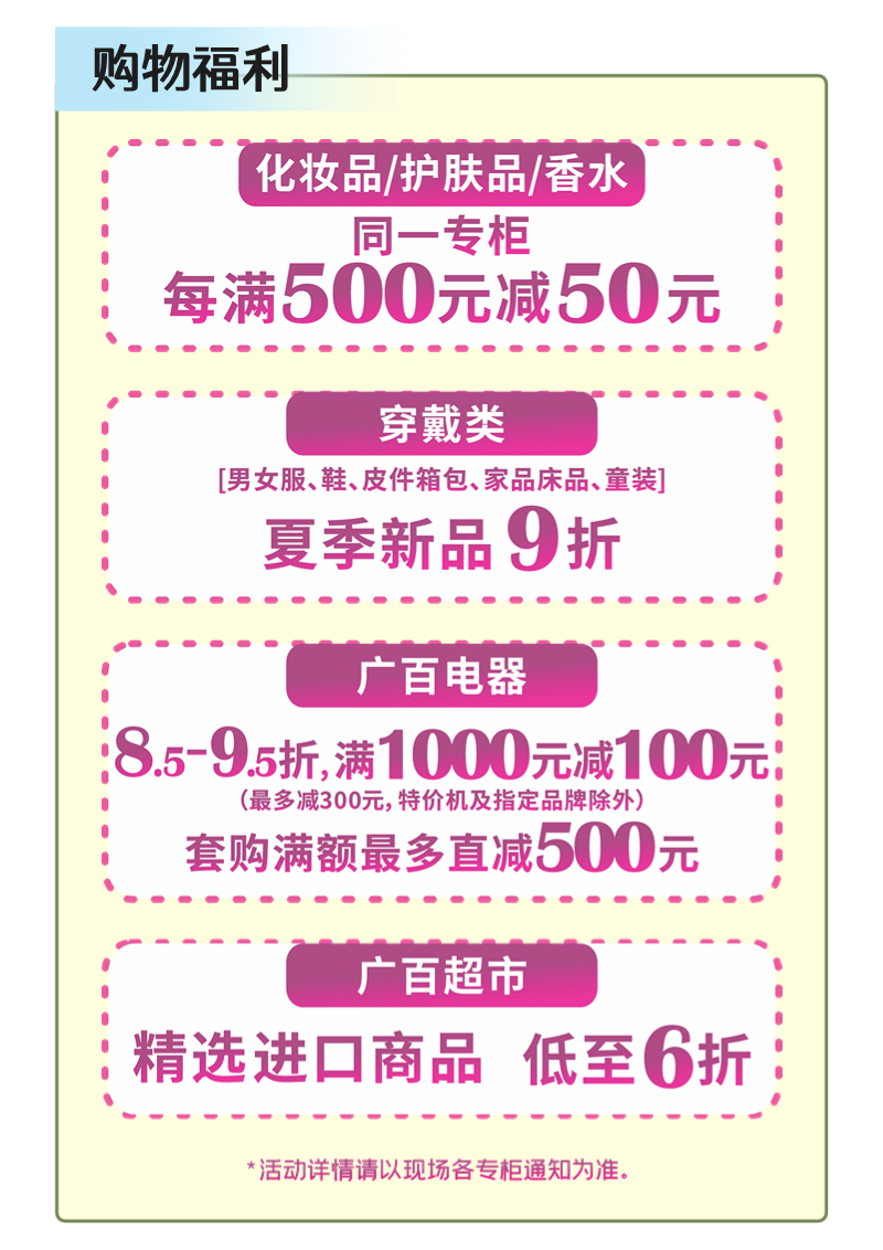 各项促销活动之间恕不重复优惠;指定商品及品牌恕不参与本次活动,恕不能同时使用促销券;会员凭会员卡参与上述活动后,部分恕不重复享受会员系列卡折扣优惠,反之亦然;各类租户消费、券类消费、银行促销、各类积分兑礼及支付、购广百积分卡等均恕不获赠广百会员积分;广州市广百股份有限公司北京路分公司对本次活动拥有法律允许范围内的解释权。
