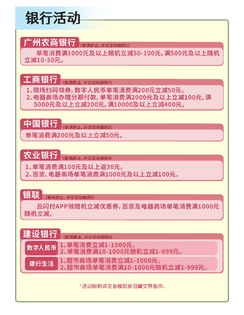 活动期间,通过实体卡或云闪付绑定62或37开头广州农商银行信用卡扫码支付,消费享单笔满1000元及以上随机立减50-100元或满500元及以上随机立减10-50元。以上两档活动,每人每月每档优惠限享1次。名额有限,先到先得,用完即止。