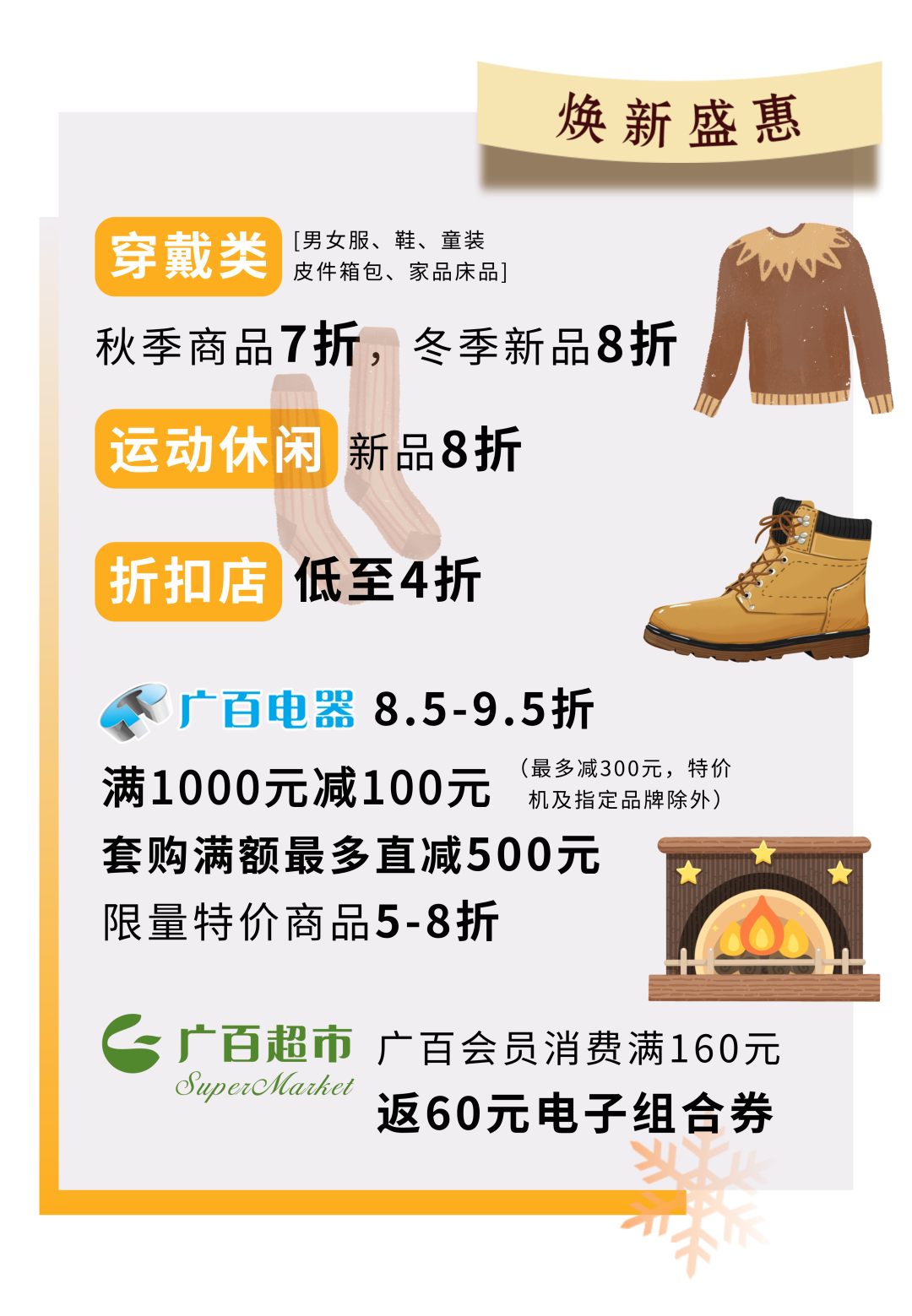 各项促销活动之间恕不重复优惠;指定商品及品牌恕不参与本次活动,恕不能同时使用促销券;会员凭会员卡参与上述活动后,部分恕不重复享受会员系列卡折扣优惠,反之亦然;各类租户消费、券类消费、银行促销、各类积分兑礼及支付、购广百积分卡等均恕不获赠广百会员积分;广州市广百股份有限公司北京路分公司对本次活动拥有法律允许范围内的解释权。