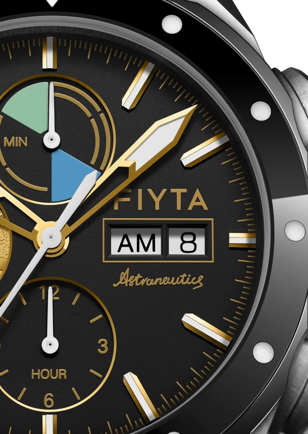 表盘:深空黑、金色;45分钟特征计时盘、秒盘(18K金、空间站对接图案)、12小时计时盘、AM/PM;夜光时标;Aeronautics标识