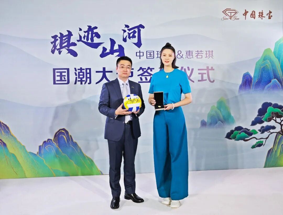 中国珠宝为惠若琪送上“美好金”系列国潮新品“山河”胸针,惠若琪也将亲笔签名的排球赠送给中国珠宝。“山河”胸针设计灵感来自祖国锦绣河山,融合了山的磅礴、水的柔美,风格时尚大气,造型简约,线条流畅,艺术感强烈,非常适合外形阳光、时尚、健康的惠若琪女士,体现了中国珠宝对中华美学时尚珠宝的独到见解,对国潮珠宝首饰的设计研发能力。