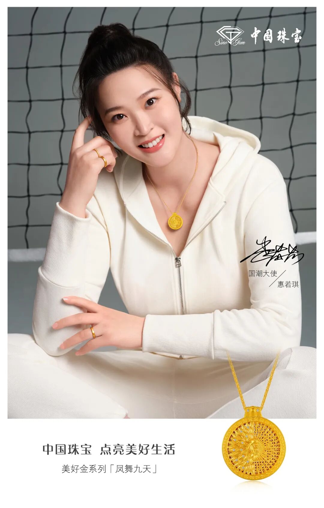 签约仪式现场,有“元气少女”之称的惠若琪梳着朝气丸子头,佩戴中国珠宝即将推出的国潮新品 “美好金”系列项链,身着蓝色运动套装登场,活力时尚,元气满满。采用古法黄金点钻工艺的“美好金”彰显出中式美学的雅致韵味,璀璨点钻则闪耀出璀璨光芒与时尚品味,为惠若琪的穿搭增添了一抹亮色,完美展现了国潮珠宝首饰的魅力。