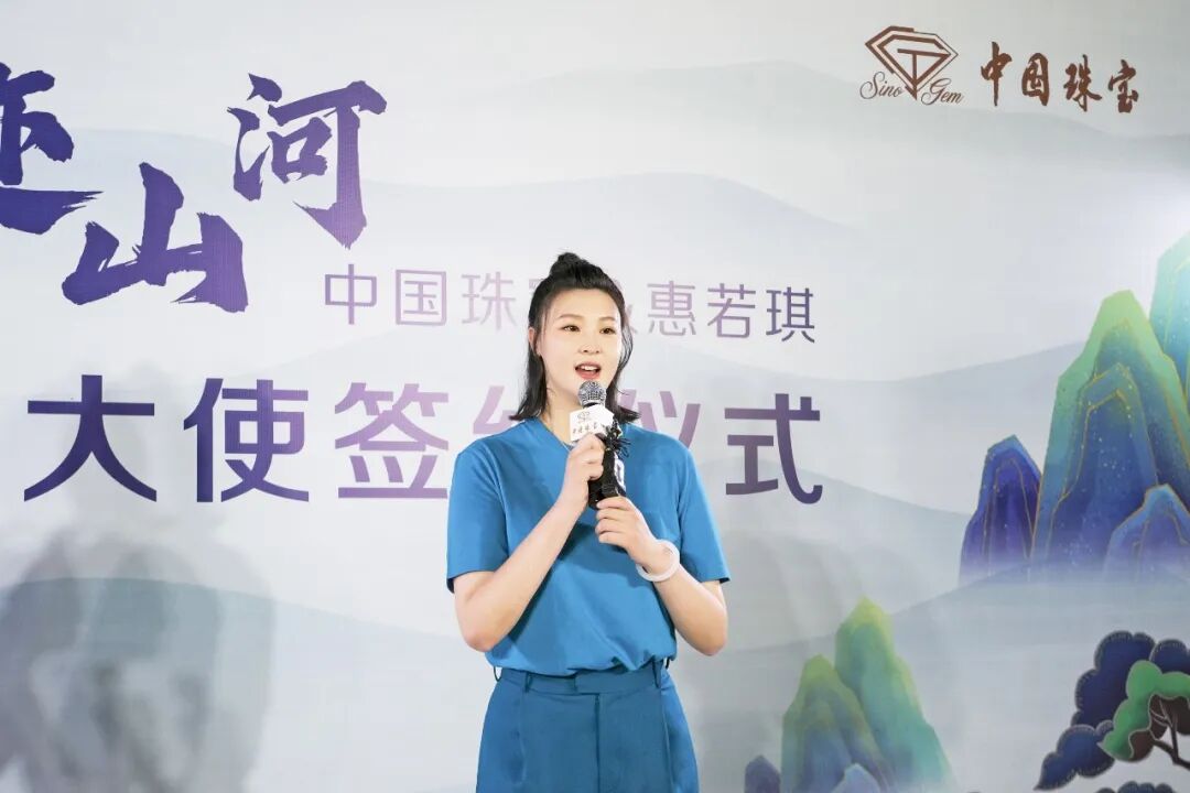 中国珠宝公司董事长、总经理王兴猛为惠若琪颁发了国潮大使水晶牌,表示:惠若琪所代表的运动员精神充满正能量,是国人的骄傲,是时代的精神符号,就是那股子韧劲、拼劲,与中国文化中的宝贵精神一脉相承,才令我们深感共鸣。“中国珠宝”品牌着力打造国潮新品,即是将中国文化中的精神、审美、技艺创新传承,发扬光大。我们希望惠若琪女士勇于拼搏的运动精神和敢于尝试的人生态度,为“中国珠宝”品牌的国潮新品注入更多丰富内涵,希望通过惠若琪女士的倾情演绎,让更多消费者领略古法金国潮首饰散发出来的时尚魅力,也希望更多人因为惠若琪和中国珠宝,更加热爱中国文化,热爱我们的大好河山。