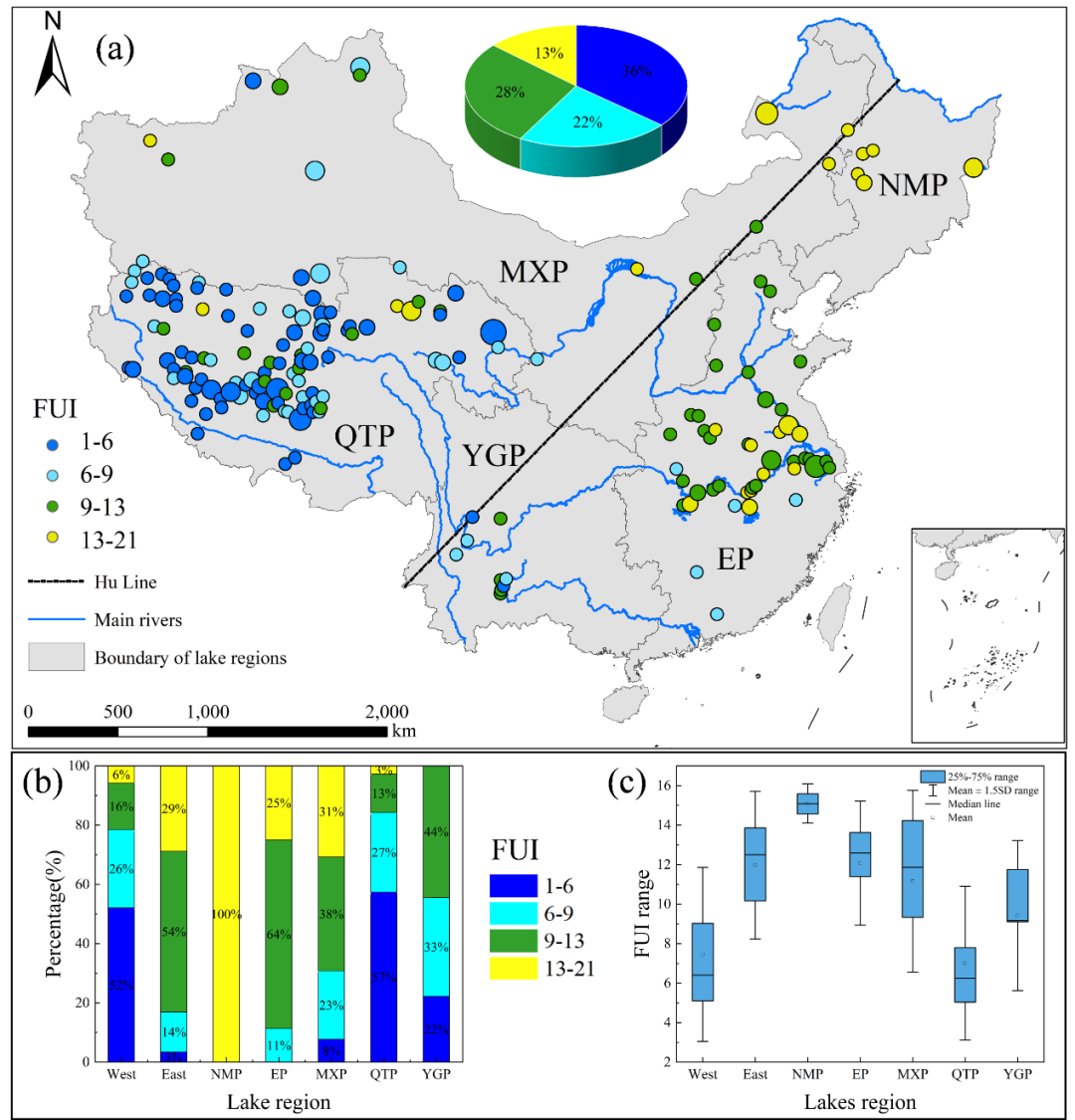 良好的水生态环境是生态文明建设的重要基础,湖泊和水库是内陆水体的主要载体,承担着多重生态、经济和社会功能。然而,全球水生态系统面临着人口增长、经济发展和气候变化带来的挑战,我国也存在水环境质量改善在时间和空间上的不平衡和不协调等问题,缺乏对湖泊现状以及变化的整体认识。在这一背景下,进行广域上的湖库水质监测是控制水体污染的关键,对水生态环境保护具有重要意义。传统的地面水质监测测量精度高,但存在空间离散,代表性差等问题,遥感具有宏观和时效性强的特点,可以突破时空约束,在大区域湖库水质的长期、快速和动态监测等方面具有独特优势,为广域湖库水质的科学认知提供了新的技术途径。改进的Forel-Ule遥感指数(FUI)水色反演模型,经过实测数据验证,表现出优异性能,为各类型湖泊长时间序列的FUI反演提供了可靠基础。新模型揭示了中国2000-2022年间大型湖泊和水库的FUI时空动态分布特征,结果显示,中国湖泊整体FUI呈现出“西蓝东绿”空间分布,过去20年来总体呈下降趋势。通过对环境因素的量化分析,发现植被、湖水面积和人为因素是影响长期水色变化的主要因素。该研究突出了高频率重访卫星和稳健算法在监测大范围水域水色中的关键作用,为未来重点流域保护修复、水生态环境管理与治理提供了重要的基础数据。