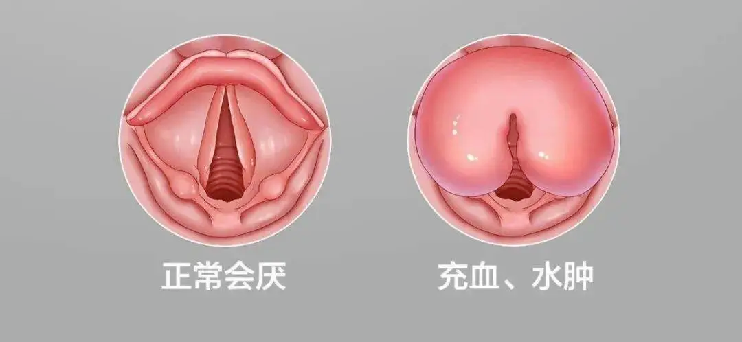 要想知道什么是急性会厌炎,那首先就要先了解什么是会厌。会厌,位于舌根和喉入口之间。你可以把它看成是一片“叶子”,一片对人非常重要的叶子。会厌的外形也确实就像是一片叶子。可别小看了这片叶子,它掌管着食物和空气去向。在呼吸、发声时,会厌会处于打开的位置,方便气流进出喉管气道。而在吞饮时,会厌则会处于关闭的位置,盖住喉咙的入口,让上方的食团及液体顺着会厌盖上面滑入后方的食管。正常情况下,人体每天无数次的吞咽与呼吸,会厌都处于这种良好的工作状态。当会厌出现炎症,短时间内发生肿胀,就会形成急性会厌炎。会厌上的组织比较疏松,一旦发生感染,就会高度充血肿胀,甚至可以肿大到6~10倍,完全可以胀成一个气球的样子。如果会厌真的球形肿胀了,就非常容易向下盖住喉入口,造成窒息甚至死亡了。