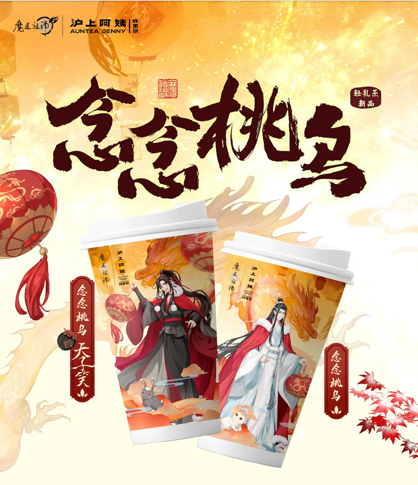 1月4日,沪上阿姨X魔道祖师动画开启联名活动,不仅推出了联名新品念念桃乌,更是对应剧情中的“天子笑”元素,推出了特调白酒风味的轻乳茶特饮——念念桃乌·天子笑!以风味突破次元壁,演绎剧集名场面,触动粉丝记忆嗨点!同时,推出了双人立牌、新年日历等多样化周边,新年氛围感直线拉满!
