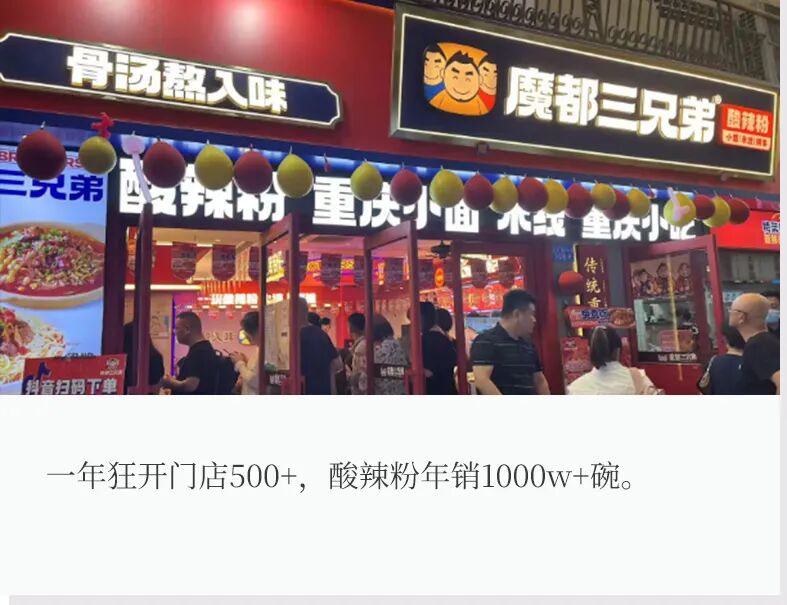 魔都三兄弟在上海一战成名,影响力却在全国范围展开,朱冠兵凭借自身的创业经验、带领团队探索、打造门店模型,在品牌、门店和产品的标准化下,门店得以快速复制从而扩展规模,成功把街边摊酸辣粉升级为全面快餐模型,开进一二线城市商场,也在下沉市场大展拳脚,为创业者提供机遇。