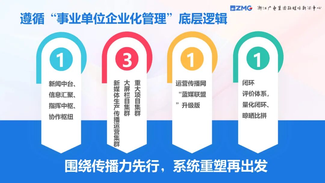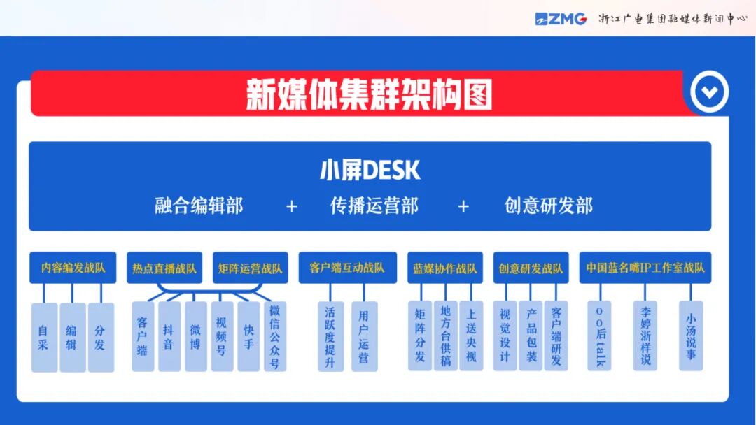 其次是结构迭代,在新媒体集群试点基础上,在中心全面推行集群战队机制,统筹全中心资源配置、耦合大小屏协同发力,真正发挥“新闻大脑”“指挥中枢”作用。此外,中心将扩大“以事定人、以事设岗、以能取人、以绩励人”的绩效考核施行范围,进一步优化人员岗位和激励机制,强化“以奋斗者为本”的考核导向,以新的运作架构、新的分配机制,激活队伍活力、员工积极性。
