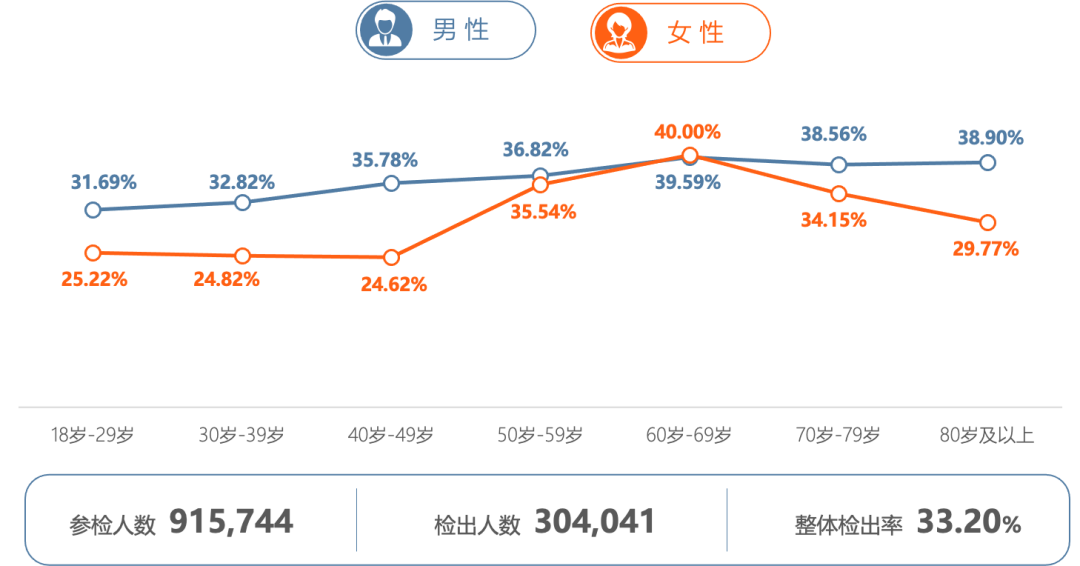 目前,在体检机构应用的骨密度检测方法包括单能/超声骨密度筛查及双能骨密度筛查。根据爱康旗下体检中心2023年1月- 2023年12月单能/超声骨密度检查在健康体检中的横断面研究数据显示,骨量减少(单能/超声)检出率达33.20%,其中50岁以上女性骨量减少(单能/超声)检出率出现快速增长,60岁-69岁到达峰值;40岁以上人群骨质疏松(单能/超声)检出率随年龄增长而增高,女性50岁以后检出率远高于同龄男性。