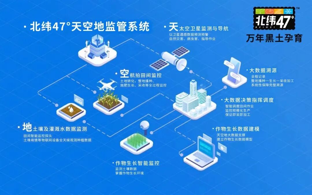 与此同时,北纬47°还通过科技的力量带动农业生产,水肥一体化种植并依靠“空”“天”“地”“人”“机”“外”六位一体农业智能感知系统,对农作物进行精细化管控、全程智能监控、数智化管理,实现高效智能的规模化、标准化农业生产作业,使北纬47°玉米的生产种植做到全程可视化、全程可追溯,安全看得见。