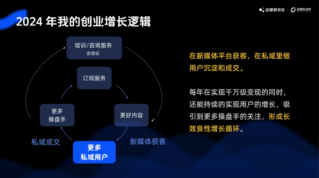 通过操盘手的实战案例输出,以俱乐部的方式吸引到更多优秀人来学习和实践,然后再通过回访,从中挖掘出拿到实战结果的操盘手,和运营社一起向行业输出更多高质量的内容。