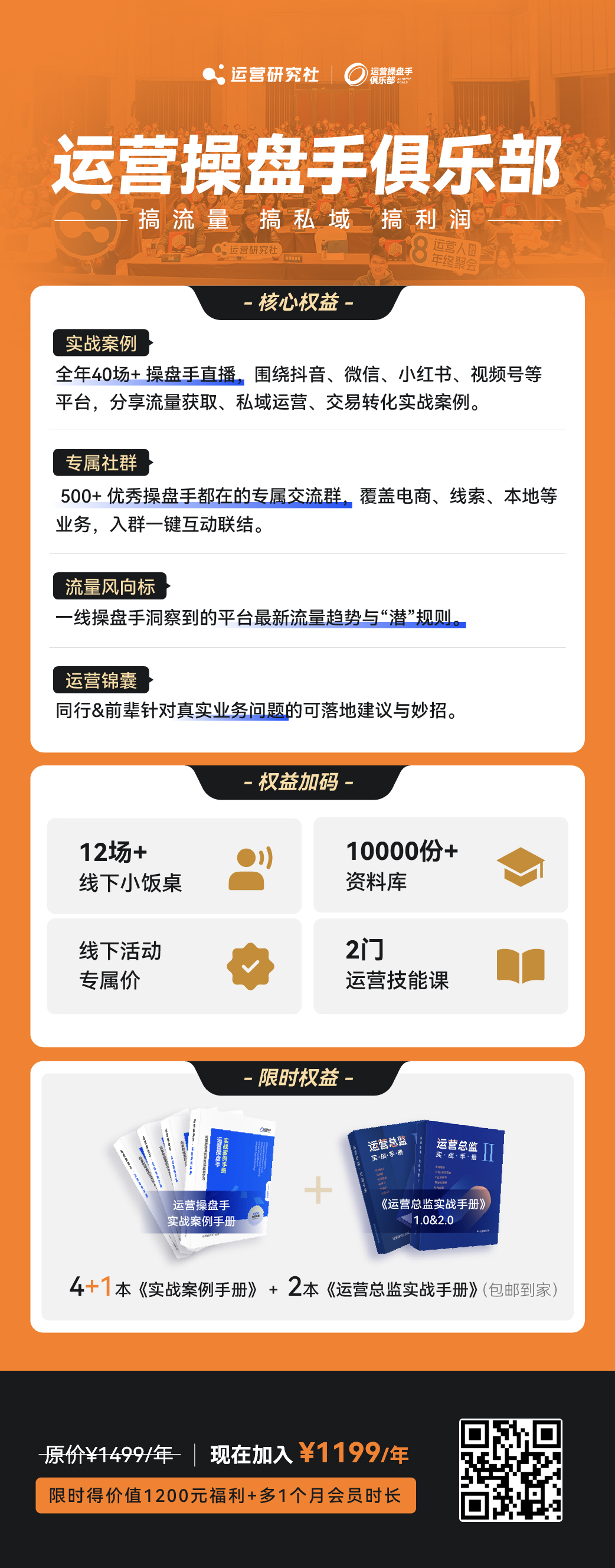 再划个重点,「运营操盘手俱乐部」简单来说,就是聚集全国对结果负责的运营操盘手,向拿到结果的优秀实战者学习。通过实战案例分享、专属交流群、精品资料库、线下活动等服务,助力大家搞流量、搞私域、搞利润。