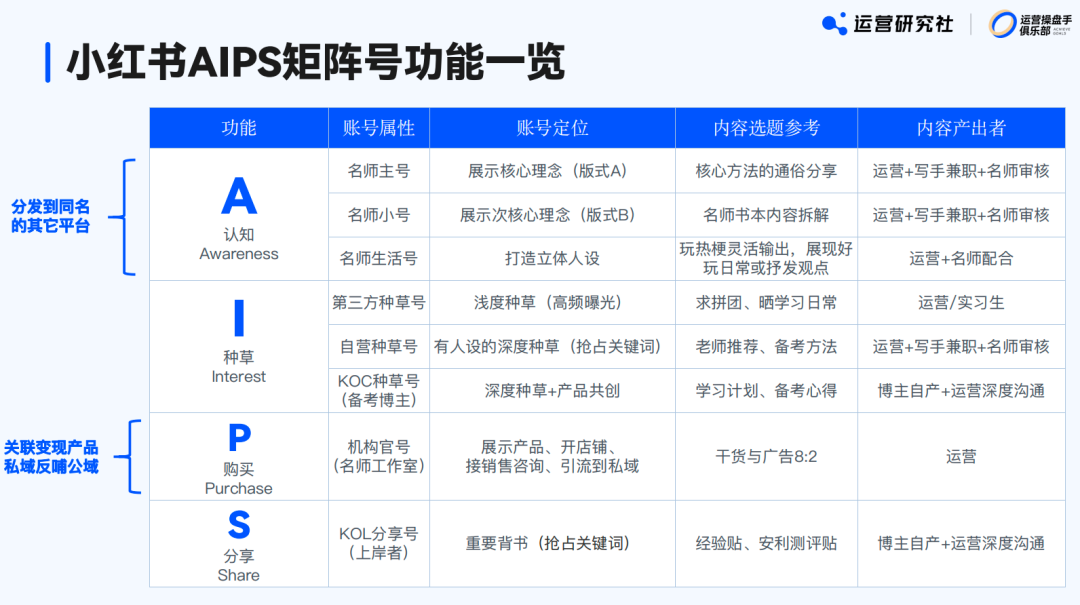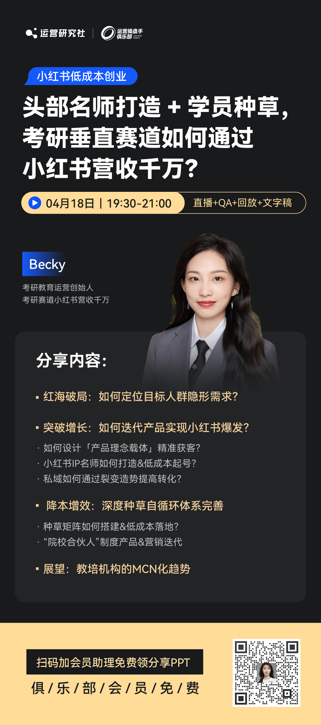 【运营操盘手俱乐部】为聚集各个行业「运营操盘手」的圈子,提供全年40场+实战案例分享、专属交流群、精品资料库、线下活动等服务,助力操盘手拿到更大的流量获取、私域运营、交易转化结果。目前已经有 500+来自电商、线索、本地型业务的优秀操盘手加入。「运营操盘手俱乐部」 嘉宾分享第21期来了!这期我们邀请到了一位教育行业在【小红书低成本创业】,做到营收千万的操盘手 becky 来进行分享!老师结合自己的专业,选择了考研里的细分赛道。刚开始做知乎关键词引流但是效果一般。后来深入挖掘目标人群的隐形需求,提出了“财经案例复试法”学习方法。22-23 all in小红书,结合这个学习方法(产品理念),产品+获客方式“双管齐下”进行迭代:在小红书快速打造了名师IP,并设计配套的「引流品」搭配私域裂变,实现高效获客转化,业绩翻了 3 倍。当然在过程中,becky老师也遇到了小团队冷启动做小红书很容易遇到的困难,比如:IP打造:IP怎么跟产品匹配?IP起号如何避免“涨粉快、变现难”?拍视频放不开、输出慢,怎么调整?引流品:怎么设计才能获取精准流量?如何用私域进一步发挥引流品价值?种草体系:矩阵号怎么低成本搭建,内容生产怎么高效配合?最值得一提的是,现在很多品牌商家都在引导做“用户种草”,包括但不限于各种礼品激励、打卡活动等。becky老师则是充分发挥考研上岸的学长学姐的作用,打造了“院校合伙人”制度,不仅在传播种草上发挥老用户的价值,还从产品层面进一步降低成本!关于“院校合伙人制度”,becky 老师会分享自己摸索出来的从招募到管理的独家思考。如果你也是教培行业操盘手或者创业者,如果你困惑于小红书怎么从0-1,如果你想了解低成本的“老用户种草打法”,本期分享一定要听!直播时间:4 月 18 日(周四) 19:30-21:00,包含 1 小时左右的分享,以及 20 分钟左右的 QA 互动。非会员对本次分享感兴趣的,欢迎扫描下方二维码添加会员助理咨询加入,在嘉宾分享结束后,可以领取本次分享的ppt 脱敏版!