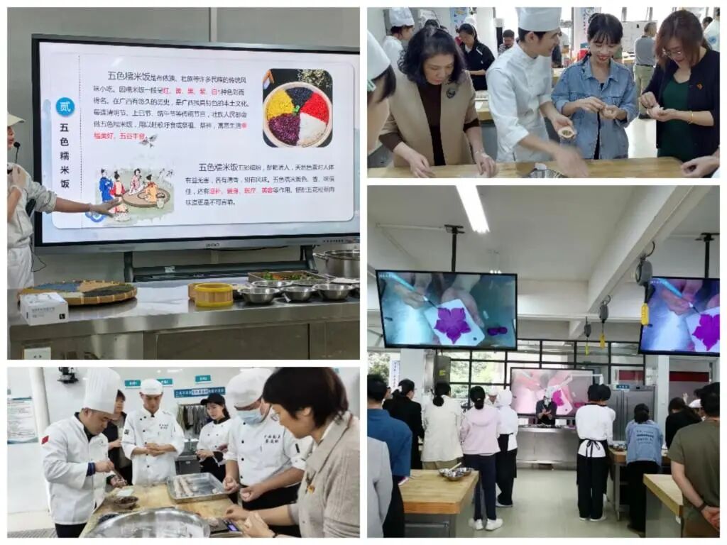 此次活动设有两个体验区,分别为技艺体验区和知识竞答区。技艺体验区:师生们采用工作人员精心准备的食材,在指导老师的耐心教导下体验了广西特色传统美食螺蛳粉、紫荆花酥、青团、汤圆、五色糯米饭和春笋包的制作技艺,大家一边制作一边听着广西壮族“三月三”节日的由来和浪漫的故事,现场充满了喜庆和欢乐。知识竞答区:同学们通过碰蛋、猜谜语、学壮语、知识竞答等方式,了解到更多的三月三传统文化。最后,师生们一起品鉴,分享亲手制作的美食。