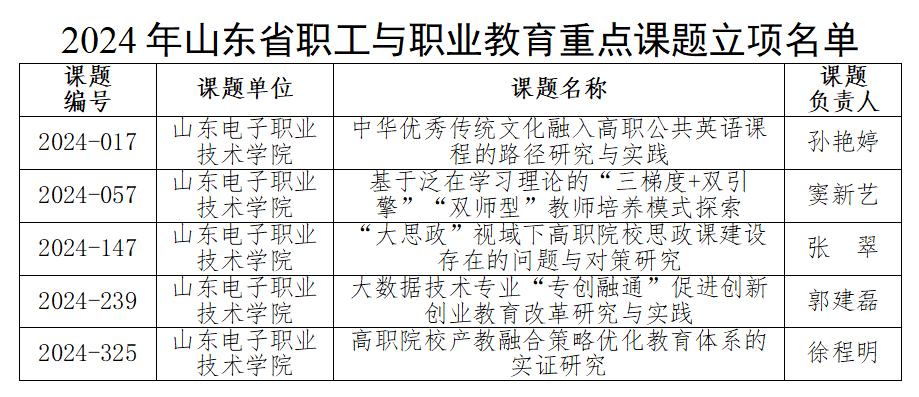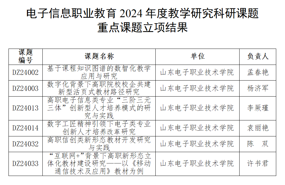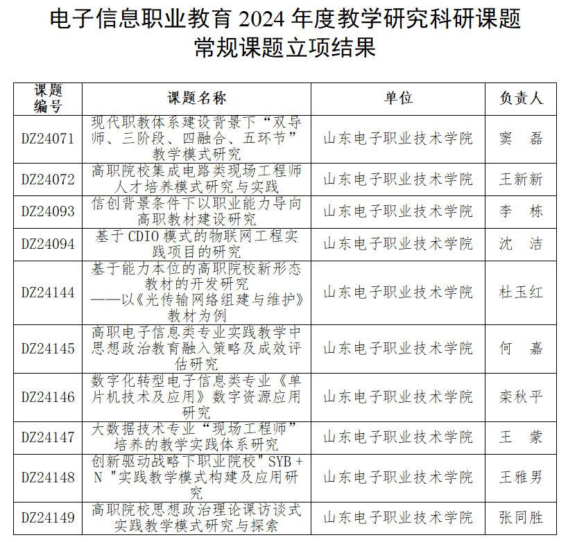 近日,全国工信行指委电子信息分指委教学研究专委会公布了电子信息职业教育2024年度教学研究科研课题立项结果,我校申报的16项课题在来自全国多个单位申报的数百项课题中脱颖而出获批立项,其中重点课题6项,常规课题10项,立项总数量及重点课题数量实现新突破。同期山东省职工与职业教育协会公布了2024年山东省职工与职业教育重点课题立项结果,我校5项课题成功获批立项。