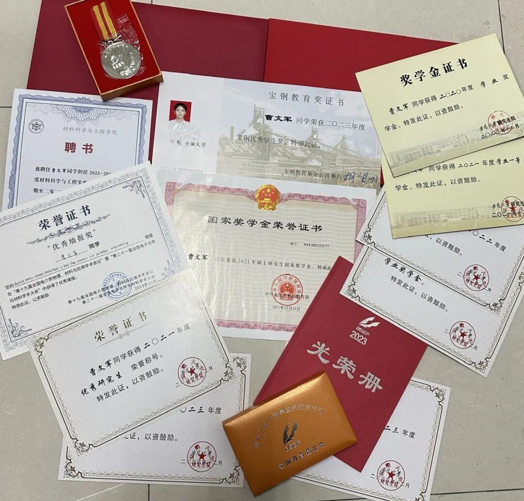 “科研不是短时间高强度的冲刺,而是一场深耕自我的长途跋涉,但科研之路并不是一帆风顺的。”凭借着一股子不服输的韧劲,曹文军逐渐找到了学习的门路,入了材料科学的“大门”,并于研究生二年级拿到了研究生国家奖学金和硕博连读的资格。曹文军说:“在硕士研究生期间,我很荣幸认识了我的师兄们,无论是思维逻辑能力强又刻苦努力的大师兄李天宇,还是认真耐心且情绪稳定的二师兄陈鹏飞都对我帮助很大,我跟随他们一起学习与生活。”