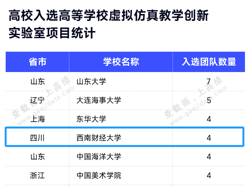 近日,教育部教育技术与资源发展中心(中央电化教育馆)公布高等学校虚拟仿真教学创新实验室项目学校及案例团队名单。西南财经大学“数据科学与商业分析虚拟仿真教学创新实验室”“数字经济法虚拟仿真教学实验室”“风险减量与绿色保险创新实验室”和“思政课虚拟仿真教学创新实验室”四个项目获批教育部高等学校虚拟仿真教学创新实验室项目,入选项目数量位居全国高校第三。