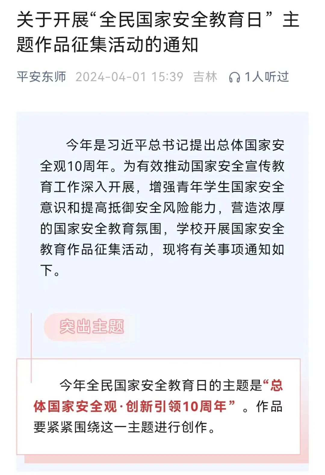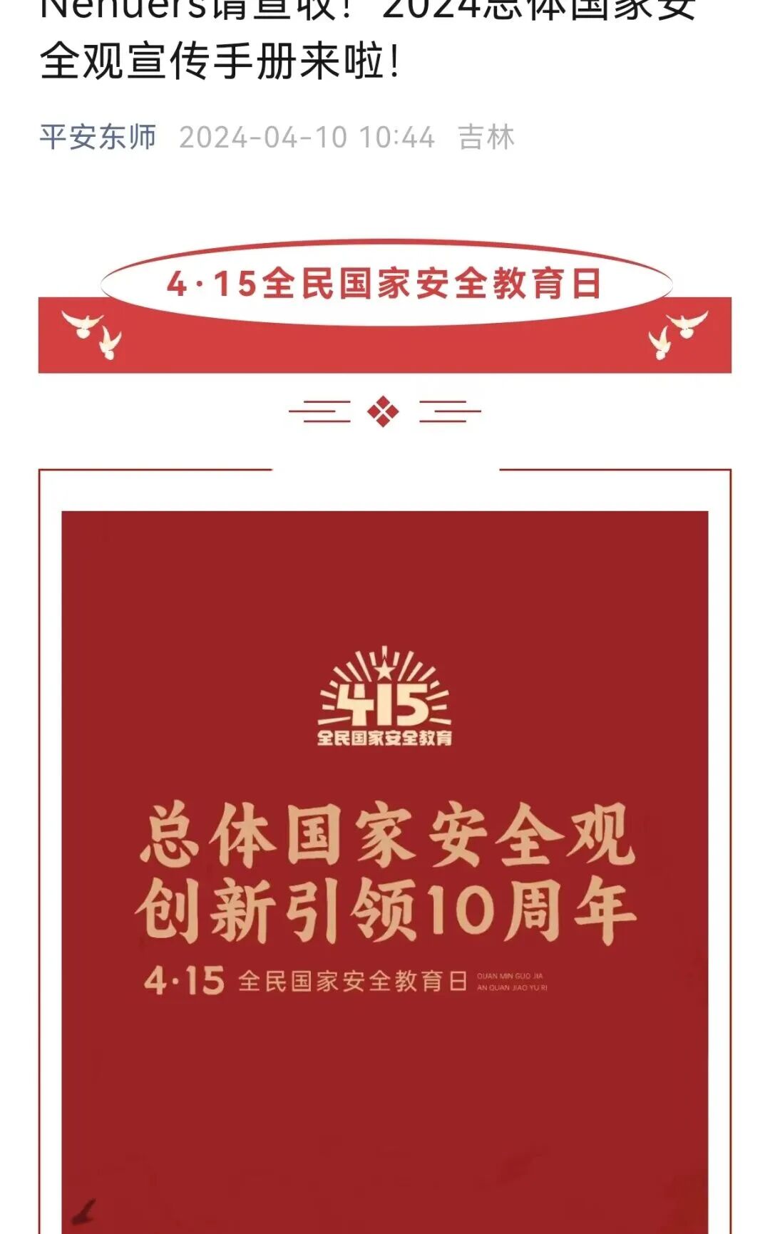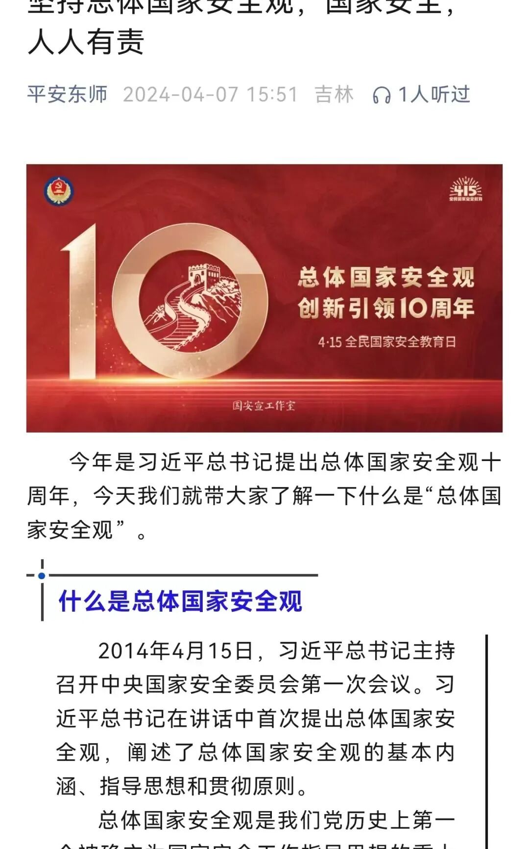 2024年是习近平总书记提出总体国家安全观10周年。今年4月15日是第九个全民国家安全教育日。今年的主题是“总体国家安全观·创新引领10周年”。