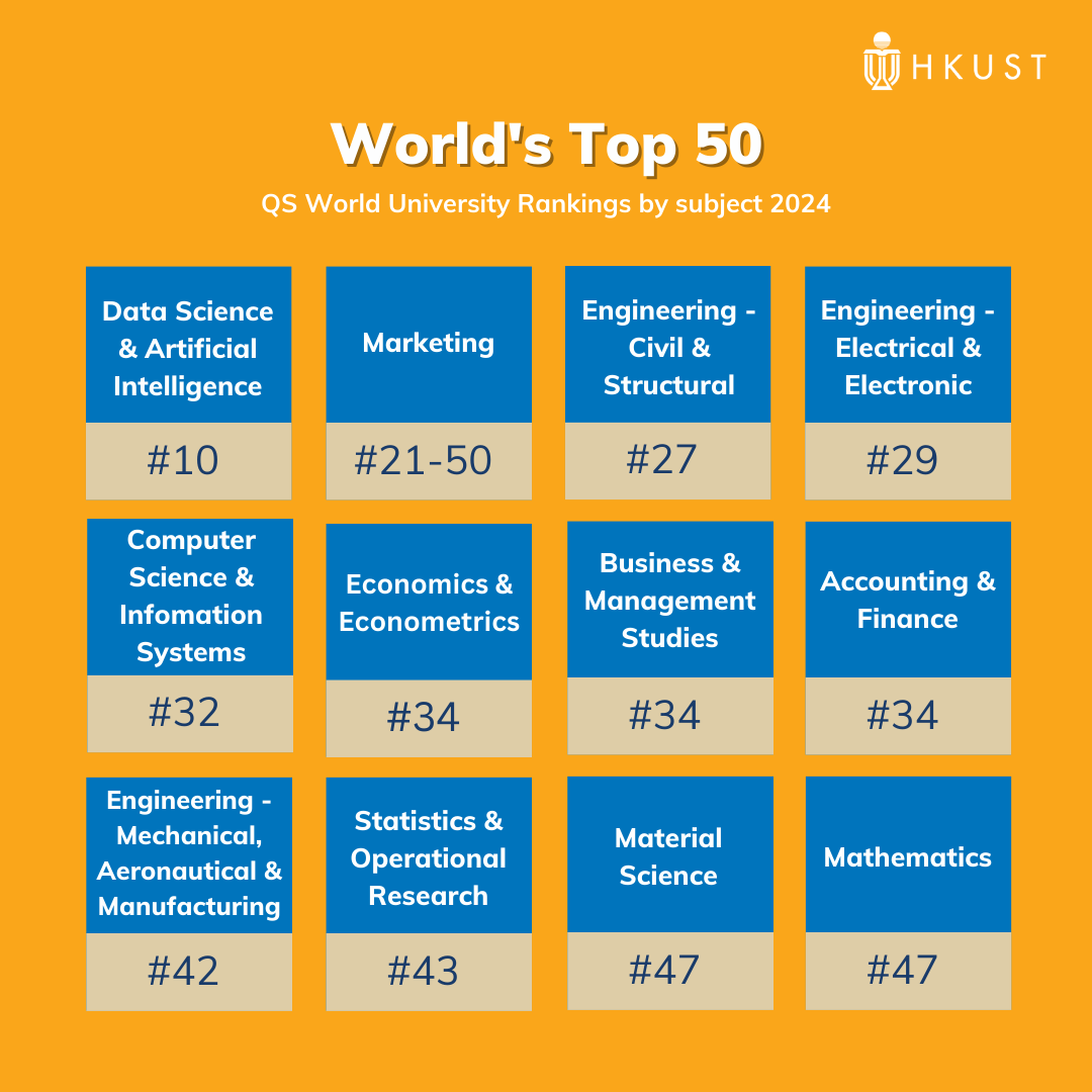 喜讯!港科大12个学科跻身2024年QS 世界大学学科排名全球前50名