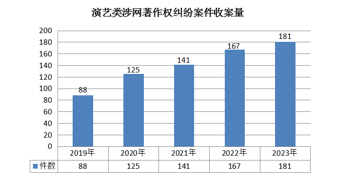 自2018年9月9日成立至2024年3月31日,北京互联网法院共受理演艺类涉网著作权纠纷案件764件,收案量总体呈上升态势。涉诉主体范围广泛,以文娱企业为主。从起诉主体来看,既包括继受权利主体,又包括原始权利人。从被诉主体看,主要包括演艺节目制作方、互联网平台运营者与表演者个人。涉诉侵权行为多样化,线下与线上行为相叠加。权利人往往对线下与线上的侵权行为同时主张权利,导致案件侵权认定复杂化。例如,被告未经授权,在街头公开场所演唱他人歌曲,同时全程录制并通过短视频平台直播,之后又将录制的短视频上传至网络平台进行传播,原告对前述行为同时主张表演权、广播权以及信息网络传播权等权利。
