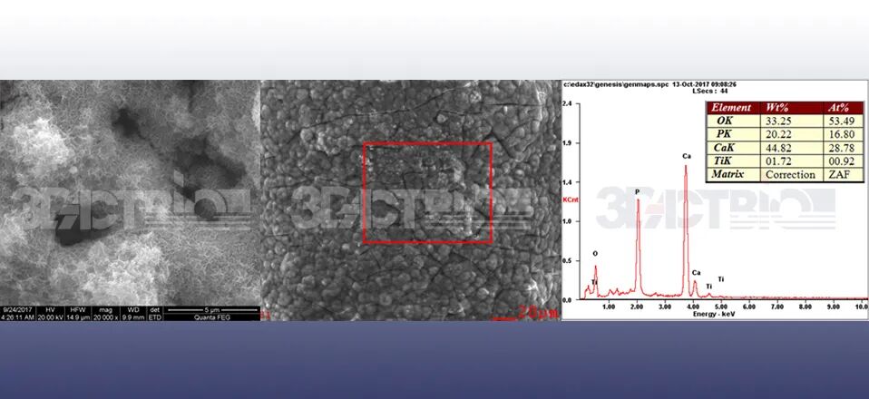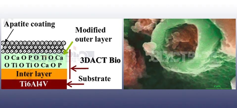 3DACT Bio作为3D打印多孔钛植入物的表面处理专利技术,可增强植入物骨整合能力。将3DACT Bio技术应用于 3D 打印的多孔Ti6Al4V植入物,可形成均匀的微孔TiO2和无定形磷酸钙膜层。处理后的植入物极大的提高了植入物的亲水性,促进细胞在其表面的粘附、增殖及分化,显示出显著的磷灰石沉积能力,促进骨整合的发生。