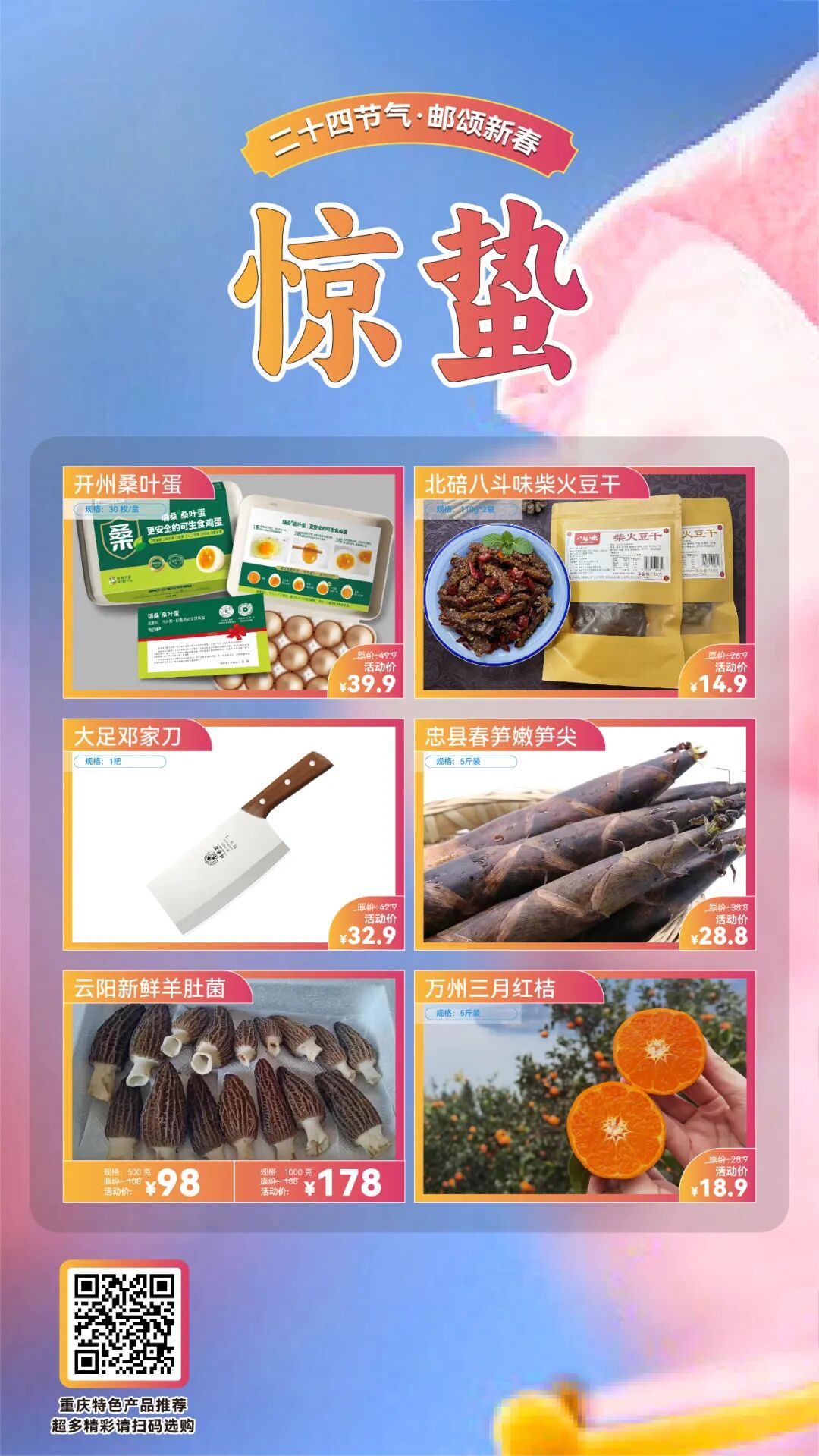 这一时期天气比较干燥,很容易使人口干舌燥,那么有哪些美食好物适宜在惊蛰节气食用呢?此时,正是云阳新鲜羊肚菌上市的时节。羊肚菌因外形酷似羊肚而得名,是一种极为珍贵的野生菌。羊肚菌有益肠胃、助消化、化痰理气等功效,可用于消化不良、痰多气短。另外,羊肚菌还具有强身健体、预防感冒,增强人体免疫力的功效。1斤原价108元,活动期间领劵后只要98元。2斤原价188元,活动期间领劵后只要178元。真的是买得越多越划算。此外,重庆邮政还推出:开州桑叶蛋、忠县春笋尖、万州三月红桔……大家前往就近邮政网点体验「邮乐优鲜」社区团购活动就能够享受优惠哟!![]()