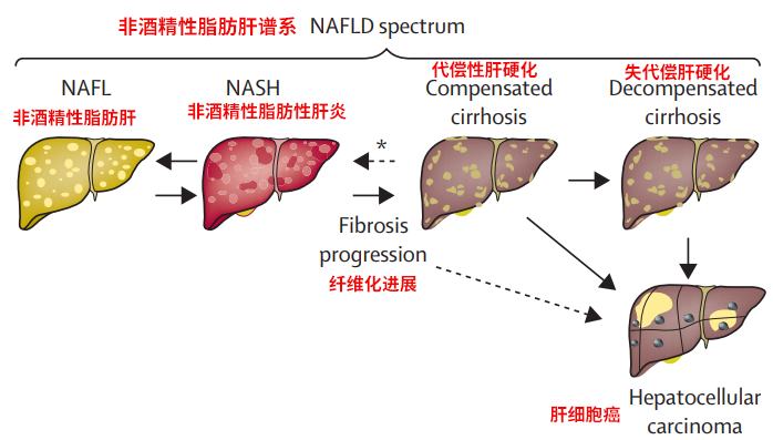 脂肪肝(fatty liver)是指人体肝细胞内脂肪堆积过多,而产生的病变。它可能由各种原因引起,发作隐蔽,早期不痛不痒,目标人群上至老年,下至儿童,简直老少通吃。根据数据显示,中国成人脂肪肝患病率或已超过35%②。而且更让年轻人羞耻的是,他们已经成为了脂肪肝的主力军……根据《上海白领健康白皮书》显示,男性白领脂肪肝比例约为48.8%,女性白领脂肪肝比例为21%③。脂肪肝虽然普遍,但不表示它正常!脂肪肝如果不加以干预,会发展成脂肪型肝炎,一步步向肝硬化、甚至肝癌进展。武汉大学人民医院对我国1999年-2018年的非酒精性脂肪性肝病人群流行病学特征进行了分析。发现2018年我国非酒精性脂肪性肝病的患病率就高达32.9%①。也就是接近3个人中,就有1个是非酒精性脂肪肝。脂肪肝一种常见的肝脏病理改变,而非一种独立的疾病。症状轻的人没有什么症状,症状重的人病情就变得特别的凶猛。因为肝细胞一旦被脂肪占据,这种情况下,虽然肝细胞本身是完好的,但它的功能会慢慢下降。肝脏只有极细的末梢神经,它很难直接向神经中枢传达信号,所以对于一般的损伤,肝脏都以其强大的代偿和再生能力默默承受着。平时也不会太影响正常生活,所以很多人已经习惯了这些病的存在,导致完全不重视,任其最终走向癌变。换句话说,轻度肝脏损伤和早期肝癌是没有任何症状的,极易被忽略,等到被发现时,往往已是肝硬化甚至肝癌!具体阶段分为:单纯性脂肪肝(脂肪肝的最初阶段)→脂肪性肝炎→肝纤维化→肝硬化→肝癌④。所谓“发胖”,指的就是肝脏内囤积了太多脂肪,从而形成脂肪肝。当体内的脂肪过度覆盖肝脏,肝脏就会逐渐产生炎症,导致肝功能异常,这便是脂肪性肝炎。如果不及时治疗肝部炎症,长此以往肝脏会纤维化,变糙变硬,最终导致肝硬化。有研究报道,非酒精性脂肪性肝炎导致的肝硬化患者5年内患肝癌的风险高达11.3%⑤。且肝硬化是肝癌的重要诱因,务必要及时治疗。脂肪肝如不进行科学干预和治疗,约有25%可能发展为肝纤维化,1.5%~8%可能发展为肝硬化⑥。