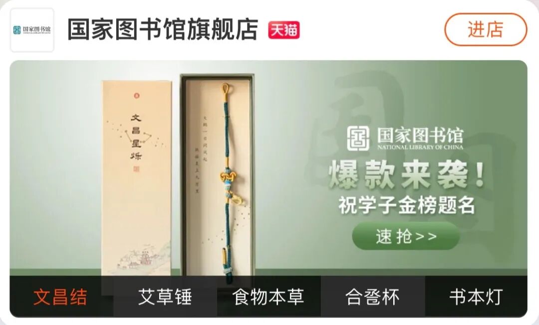 事情是这样的,自淘宝路边社推出“国货品牌组团出圈计划”后,我们一直在找机会为各个国货品牌打广告。就比如,之前为国家民委的文宣平台“道中华”写的推送:但因为我太懒忙,所以这个栏目更新得就有那么一丢丢慢。总之,这次要为各位推荐的国货品牌是:国家图书馆旗舰店。如果乍一看名字让你觉得陌生,那么不妨看看下面这个,来自国家图书馆旗舰店的文创产品:还是没啥印象也没关系,放这个徽章主要是想提醒各位:还有一个多月就要高考了。言归正传,国家图书馆旗舰店是国家图书馆于2019年8月开设的淘宝店铺,而淘宝也是国家图书馆开启线上销售的第一个平台。“借由淘宝优势和人群优势,我们可以更好地将优秀的中华传统文化传播出去,同时也能更加及时地了解消费市场需求,帮助品牌打造有影响力和生命力的新品。”