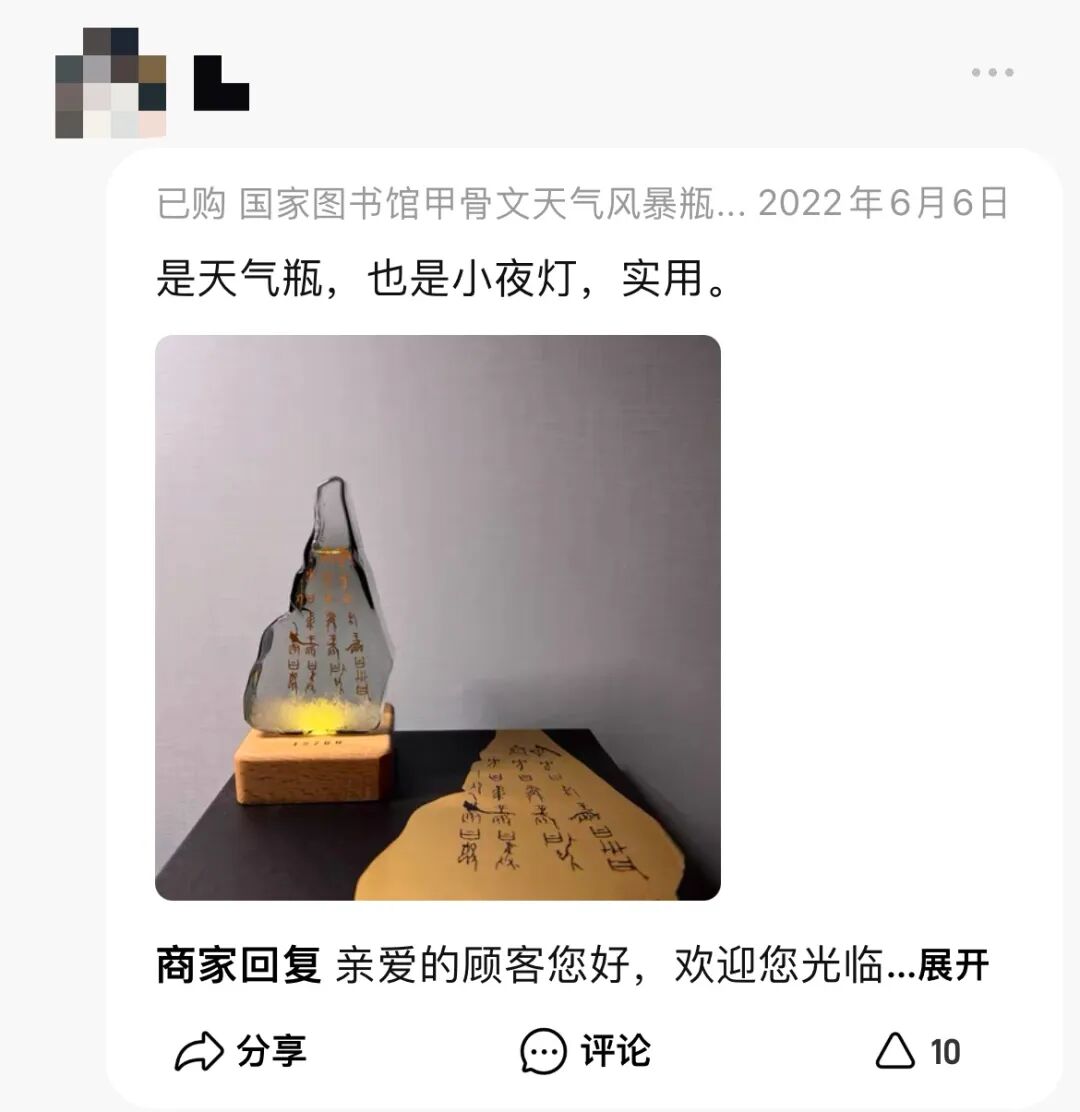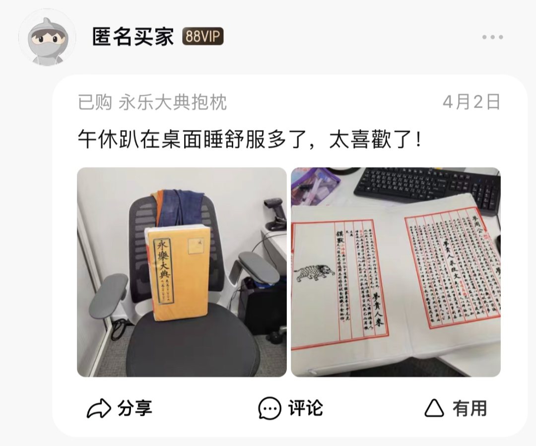 有意思的是,虽然是国家图书馆官方店,但他们确实不怎么卖书,而是主要卖各种脑洞大开的文创产品。就比如,开篇提到过的“逢考必过”徽章,以及下面这个“《永乐大典》抱枕”:我知道你在期待什么,他们确实把鲁迅的那些梗都致敬了一遍:而这些鲁迅系列的文创产品,灵感基本都来自于鲁迅的诸多手稿,所以鲁迅确实说过下面这句话:如果点开这个系列的评论区,你就会发现,把梗学以致用的不止是文创产品设计师,还有那些在淘宝上下单的年轻人:鲁迅在《热风》里写过这样一段话:“愿中国青年都摆脱冷气,只是向上走,不必听自暴自弃者流的话。能做事的做事,能发声的发声。有一分热,发一分光,就令萤火一般,也可以在黑暗里发一点光,不必等候炬火。”有人把“摆脱冷气”理解为不做沉默的大多数,做事、发声;有人把“摆脱冷气”视作勇往直前的人生信条,发光、发热;也有人把“摆脱冷气”当成撞南墙时的自我安慰,向前看、不回头。而国家图书馆旗舰店的设计师们,把这段抽象的话,打磨成了一条确实能够摆脱冷气的毛毯,让遥远的文字拥有了触感和温度。国家图书馆旗舰店,其实就是在用商品的形式做阅读理解,而他们的题库则是国家图书馆内上下五千年的典籍、先人们超脱于时空的内心宇宙。购买国家图书馆旗舰店的文创产品,不但能够给你带来实用与情绪价值,还能为你提供亿种阅读理解的思考方向。就像把《食物本草》里的柿子图,做成和书的主题相契合的艾草锤一样,通俗又硬核:以及,把和甲骨文相关的知识,包装成“甲骨文考古挖掘盲盒”,让消费者在使用的过程中,既收获了知识,又得到了成就感:甲骨文是中国商周时期刻在龟甲和兽骨上的文字,是世界四大古文字之一,中国已知最早的成系统的文字,是殷商先人留给我们珍贵的文化遗产。国家图书馆的甲骨收藏高达35651片,收藏量约占存世总量的四分之一,是目前世界上收藏甲骨最多的单位。所以,甲骨文系列在国家图书馆旗舰店最初开发的文创产品中占了较大比重。繁杂的校对与整理工作,并没有消磨掉设计师们的热情,反而产生了诸如“天气风暴瓶”这样,让甲骨文不再那么古板的小玩意儿:从鲁迅系列中“摆脱冷气毯”的发货打包方式就可以看出,国家图书馆旗舰店背后,是一群有情怀、有活力、热爱中华传统文化,又擅长上网冲浪的年轻人。2020年4月,发现越来越多的消费者对商品详情页失去耐心的运营团队决定,在国家图书馆旗舰店的基础上,原地整个淘宝直播间。说是直播带货,但更像是把央视的《百家讲堂》《我在故宫修文物》一类的,有文化但又不失趣味性的内容搬到了淘宝直播间里。直播完了还会整点带有知识增量的短视频,让用户看完不止图一乐。下面这款,取材自“敦煌遗书”中《佛说般若波罗蜜多心经》的“心经杯”,就在淘宝直播间以及逛逛短视频的加持下,上架仅一季度销售额就突破了200万元。冷知识:《佛说般若波罗蜜多心经》就是唐僧老师翻译的,也就是这位的历史原型:当被问到国家图书馆为什么要做文创产品时,负责人这样回答我:“让国图馆藏优秀文化资源以喜闻乐见的形式融入人们生活,满足读者精神文化需求,让大家通过文创媒介传承中华有限传统文化,增长知识,在分享中体验阅读的乐趣。”