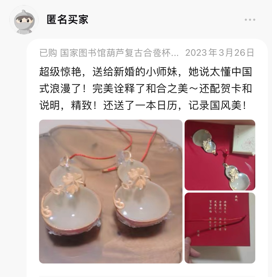 在信息载体日渐丰富的今天,人们能够阅读的对象已不仅局限于书本。知识的获取可以来自照片、视频、播客,或是一个有文化底蕴的文创产品,而阅读所能带来的乐趣,其实就像学生时代的阅读理解,在抽丝剥茧的过程中获得一些感悟。这是一种错位的共振,一种短暂跳出历史框架的解法,一种来自遥远年代的情绪价值。就像你不用知道宋代有个叫王得臣的人,在《麈史》里写过这样一段话:“古者,婚礼合卺,以双杯采丝连足夫妇传饮,谓之交杯。”当看到下面这张商品图时,自然就能感受到古人的浪漫、传统文化的魅力:虽然肯定不是所有人都能考上理想的大学,但还是祝各位即将迎来高考的学子们:文昌星烁,金榜题名。