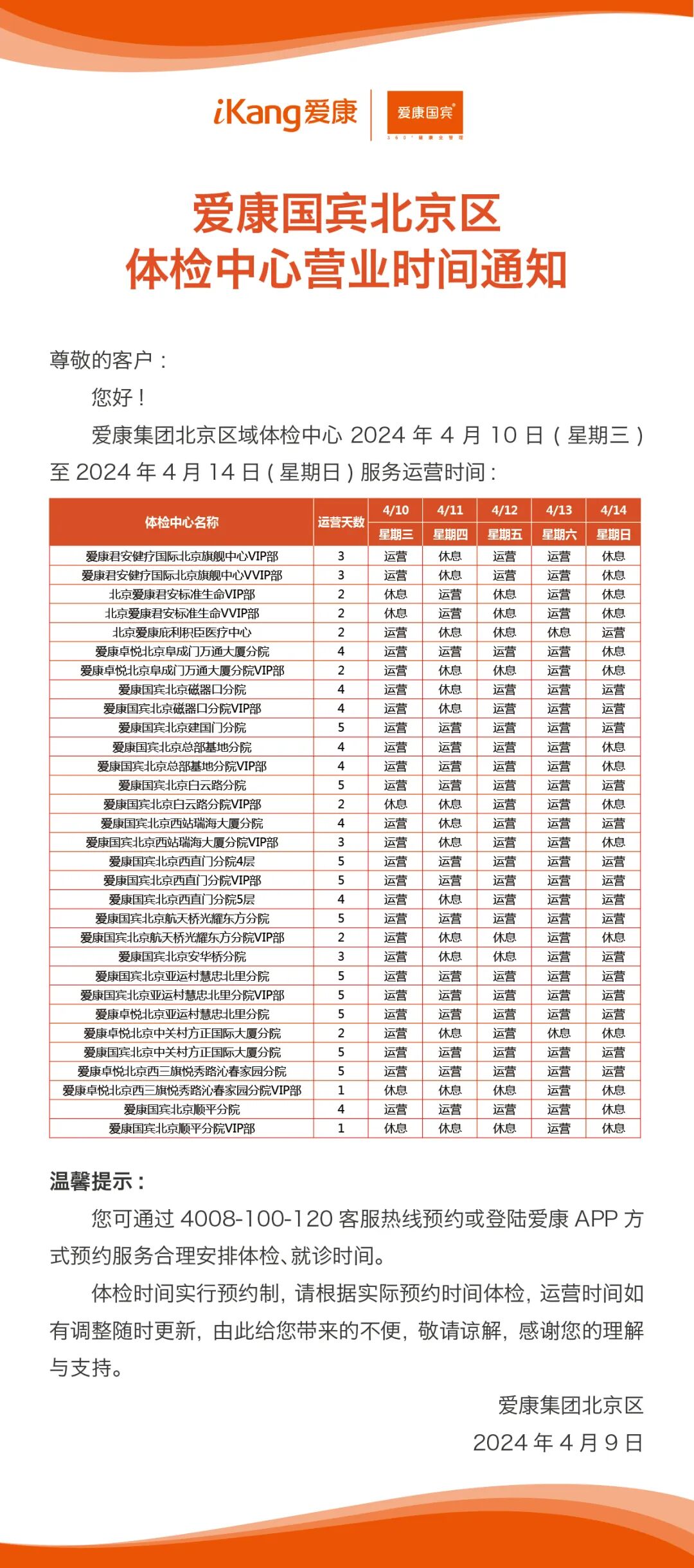 重要通知!爱康北京区域各体检中心4月10-14日营业时间安排
